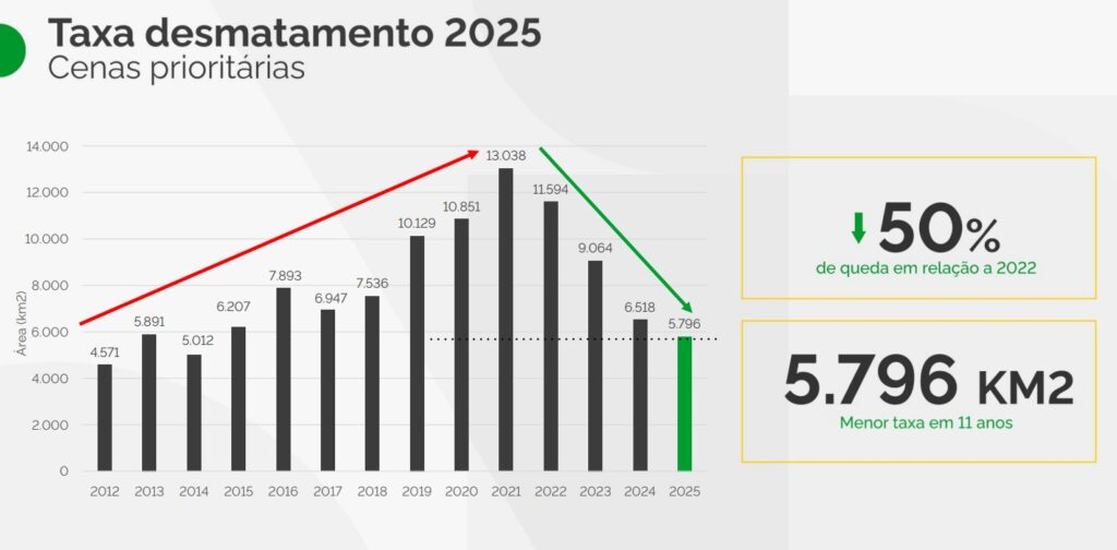 Os números da Amazônia são expressivos, especialmente quando comparados a períodos recentes. Em 2021, sob a gestão anterior, a área desmatada atingiu 13.038 km² — valor superior à soma dos resultados de 2024 e 2025. Em 2022, ainda eram 11.594 km².