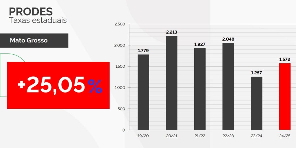 No entanto, em meio à tendência positiva, Mato Grosso destoou: foi o único estado da Amazônia Legal a registrar aumento no desmatamento, com 1.572 km² derrubados – alta de 25,05% em relação ao período anterior.