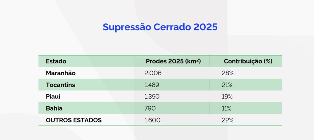 No Cerrado, após o pico de 11.011 km² em 2023, o desmatamento caiu para 7.235 km² em 2025 — redução de 11,5%. Segundo o Inpe, a maior parte das áreas abertas se concentra no Matopiba (Maranhão, Tocantins, Piauí e Bahia), responsável por mais de 70% dos registros nos últimos três anos, chegando a 77,9% em 2024/2025, conforme dados do Programa BiomasBR.