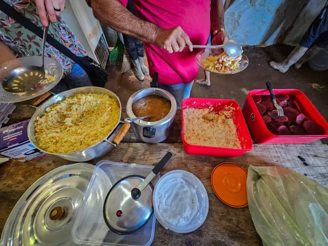 Às quatro da madrugada, Giovana prepara o café da manhã: pão fresco com manteiga, bolo de abacaxi e café forte. As massas, feitas na véspera, seguem para o forno quando o garimpo ainda dorme. Ao meio-dia, sob o sol estalando, começa outra rotina: preparar as marmitas para os garimpeiros que não podem abandonar os postos. Os que almoçam na cozinha formam fila.